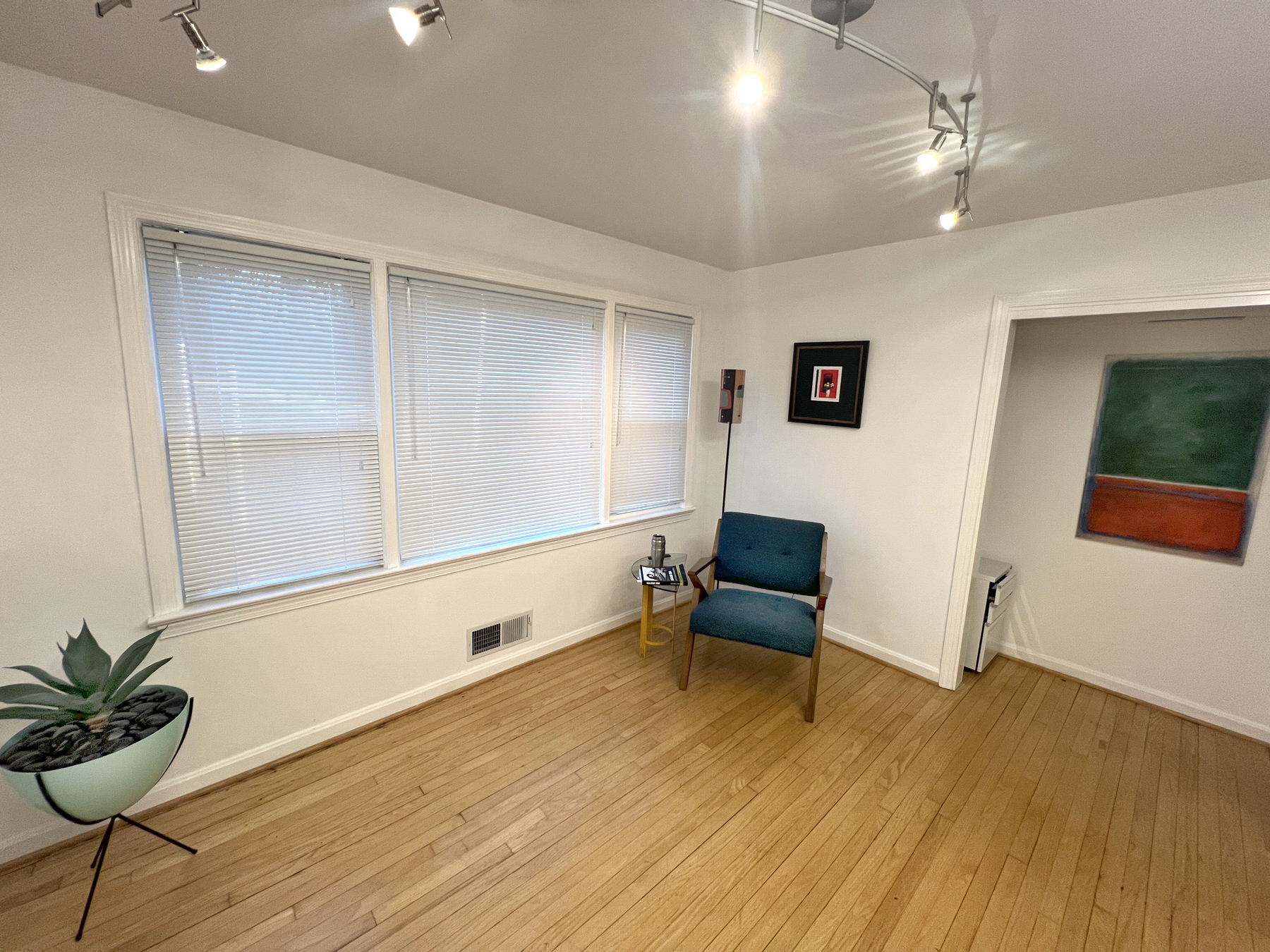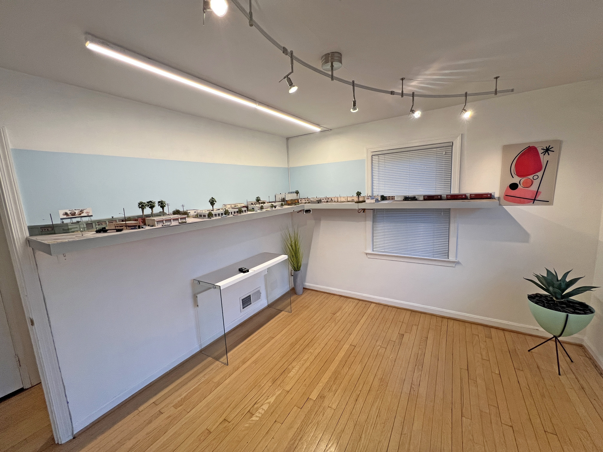 A view of the LAJ layout room facing the other direction, with the layout to my back. The alcove holds a small library of books and reference magazines I refer to most frequently. I have more shelves in the basement for the remainder of my resources. I like spending time in the room and just enjoying the experience of having the the 1960s LA scene wrap around me.
